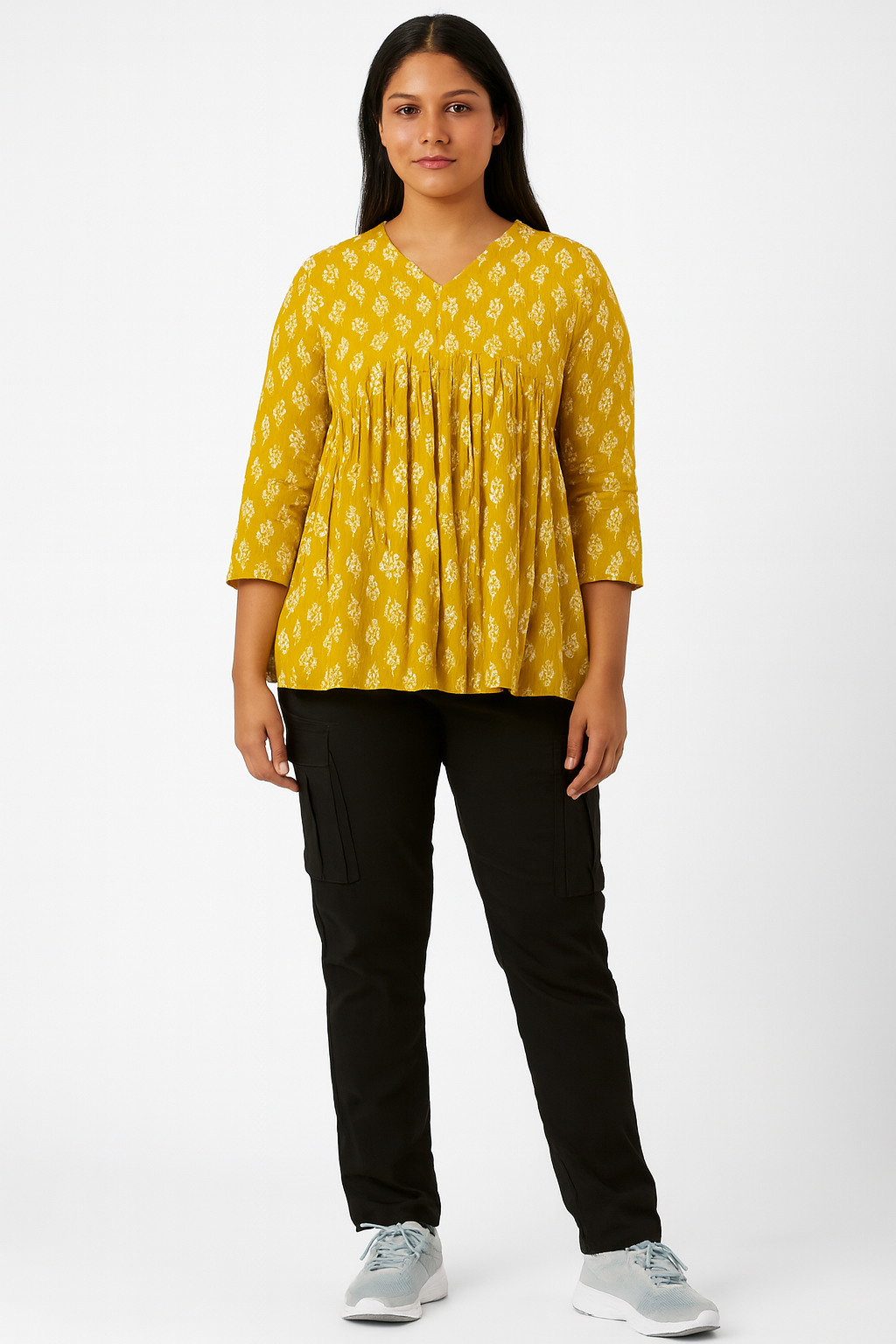 Made from 100% breathable cotton, Soft pink base with subtle white floral prints, V-neckline for a refined, comfortable look, 3/4 sleeves ideal for year-round wear, Lightweight and gentle on the skin
